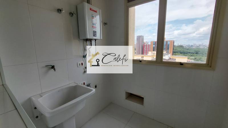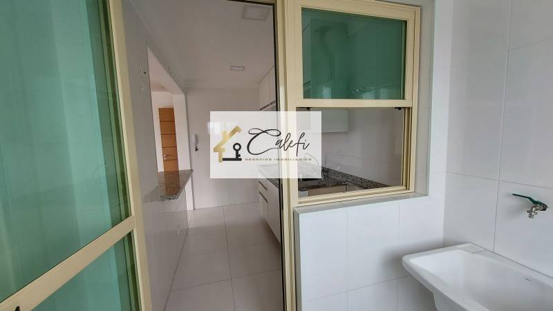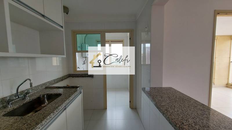 Cozinha tipo americana com balcão e armários novos de alto padrão com área de serviço ampla iluminda e arejada.