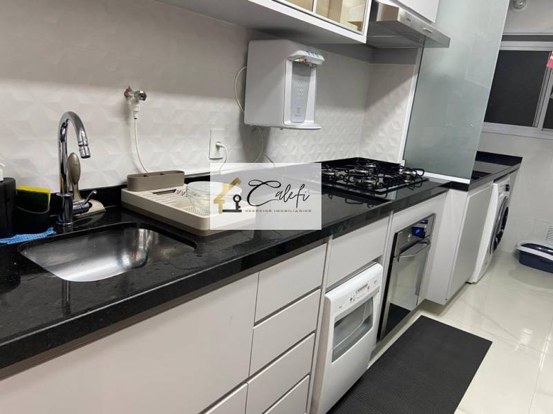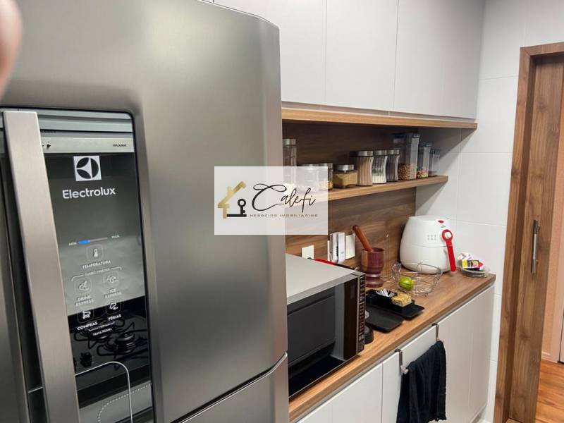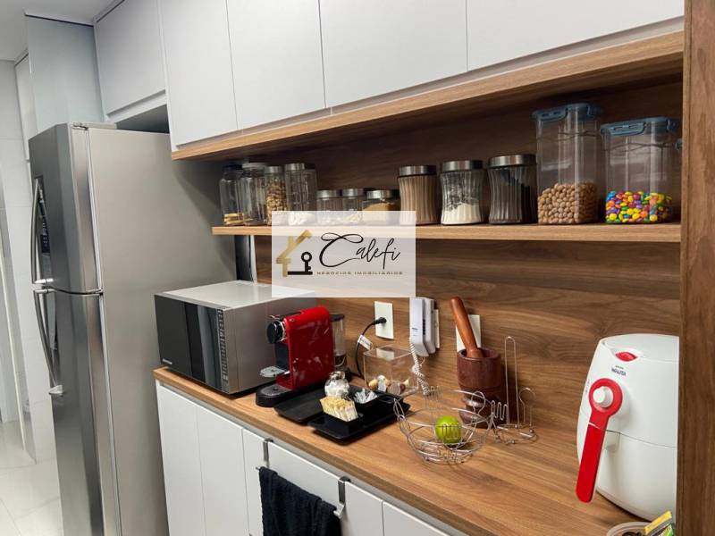 Cozinha com armários embutidos com área de serviço integrado, com agua quente nas tornerias, inclusive na sacada gourmet.